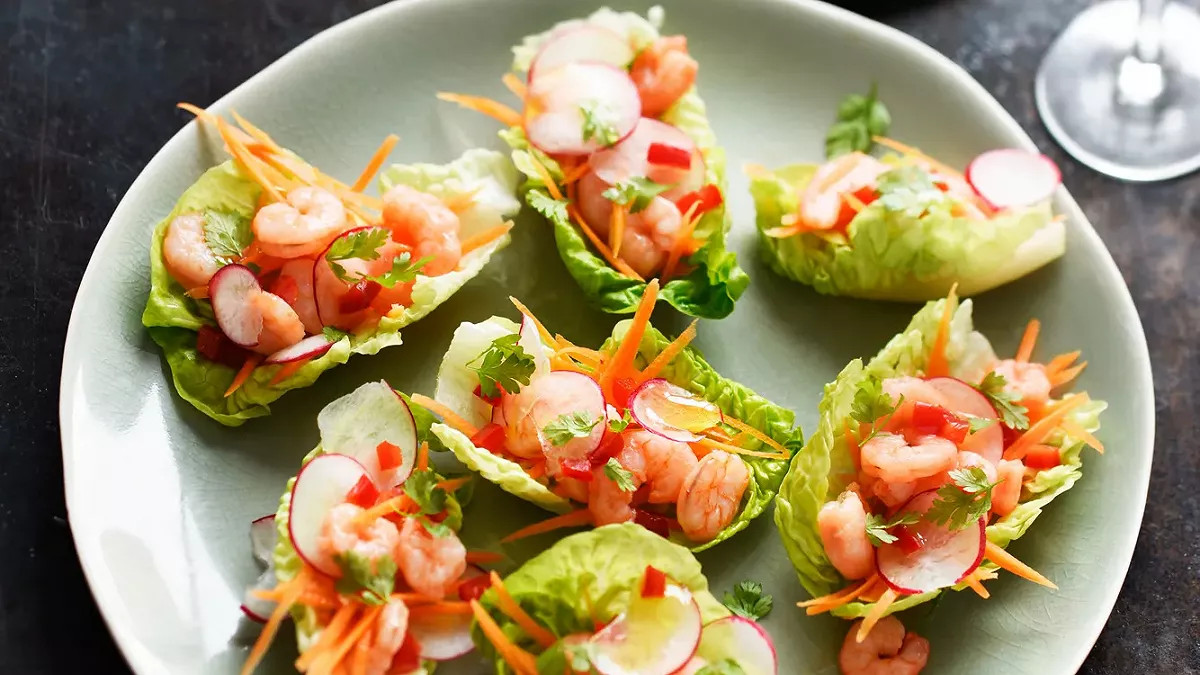 Sucrine farcie de carottes, concombre, radis, crevettes et herbes fraîches