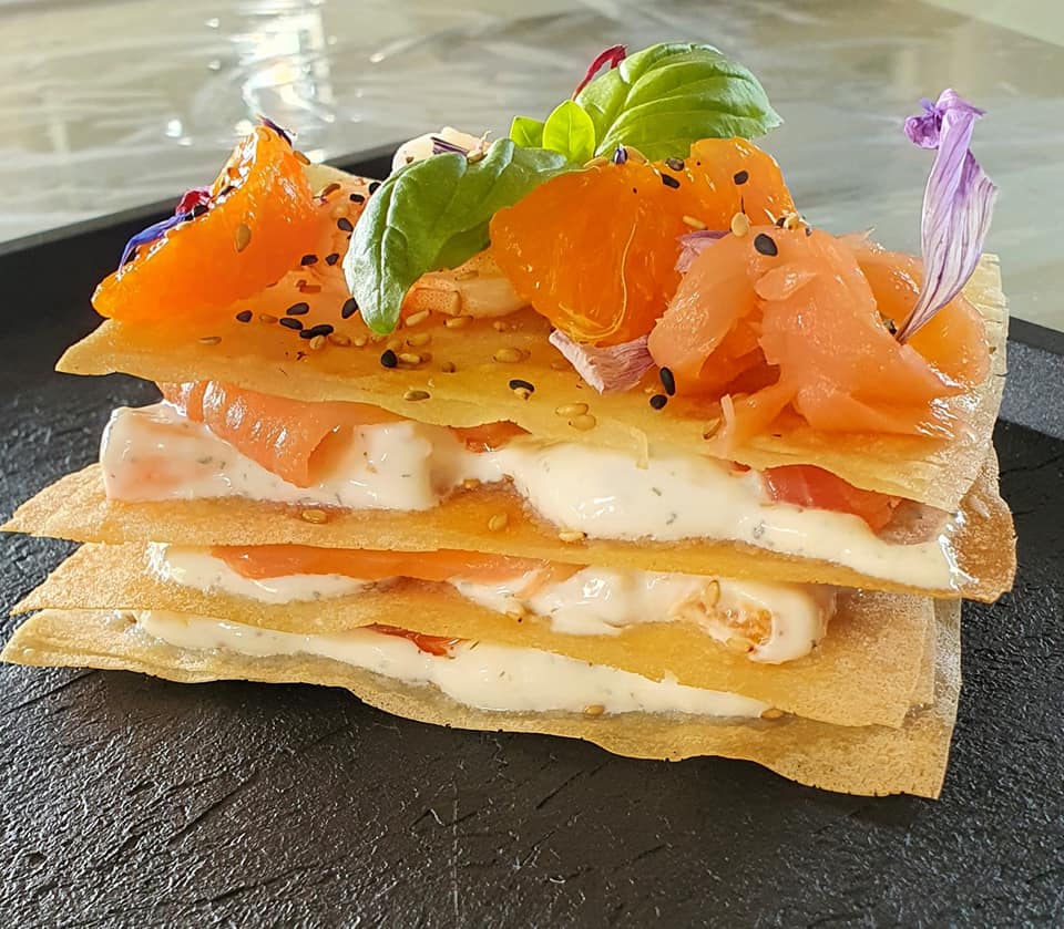 Plaque de pain Suédois, saumon fumé, pouligny saint Pierre, mascarpone, échalote