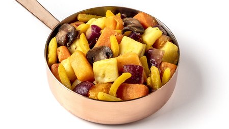 Butternut, patate douce, carotte jaune, pomme de terre préfrite, oignon rouge grille, champignons