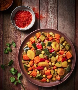 ingrédients : carottes, courgettes, aubergines, oignons, poivrons rouge et jaunes, abricots secs, pois chiches, raisins secs.