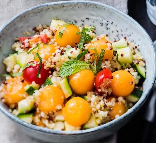 tomate cerise, melon, courgette, citron, menthe, quinoa