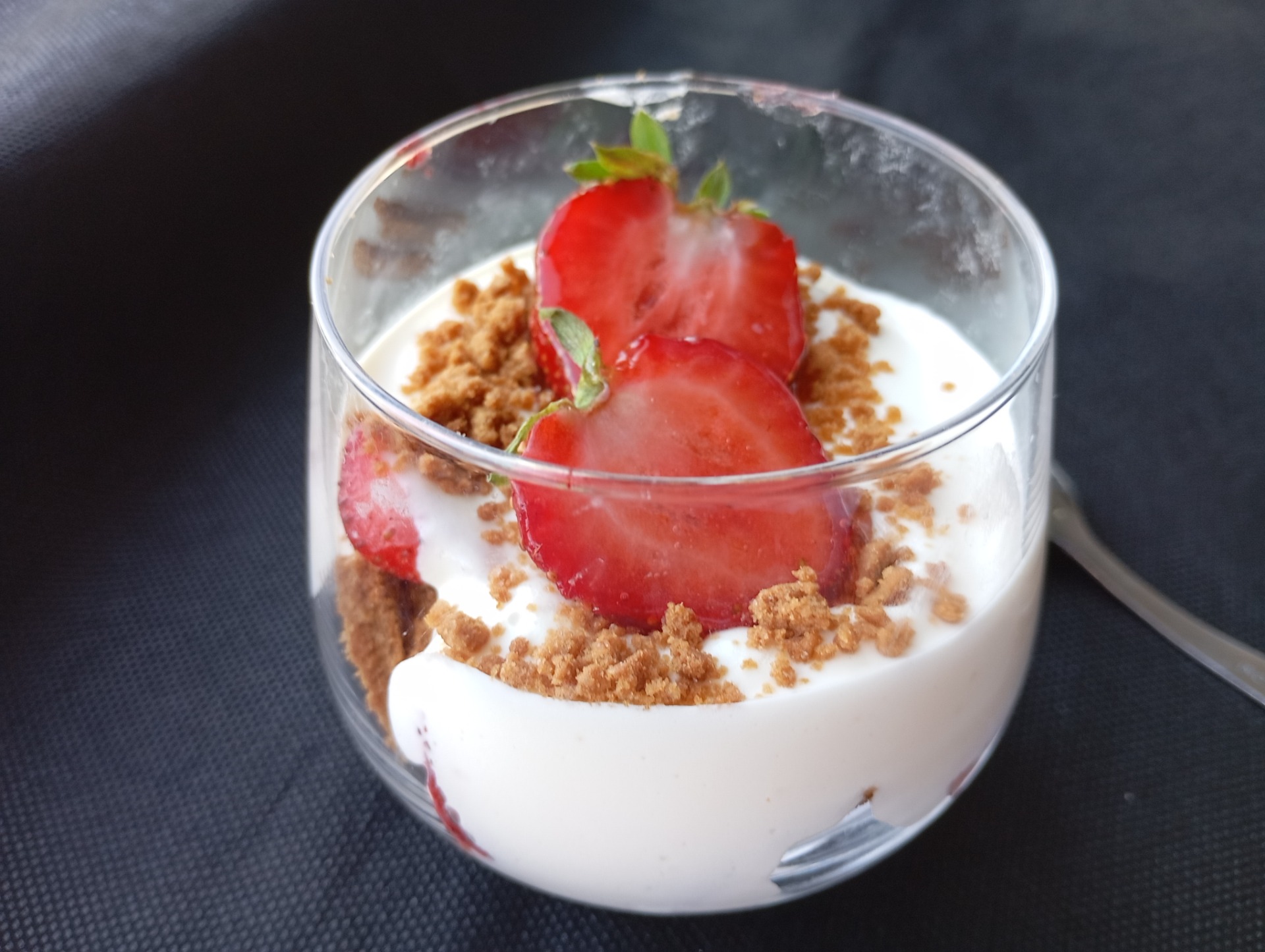 Appareil à tiramisu, biscuits cuillère, écrasé de fraise et nappage avec décoration fraise
